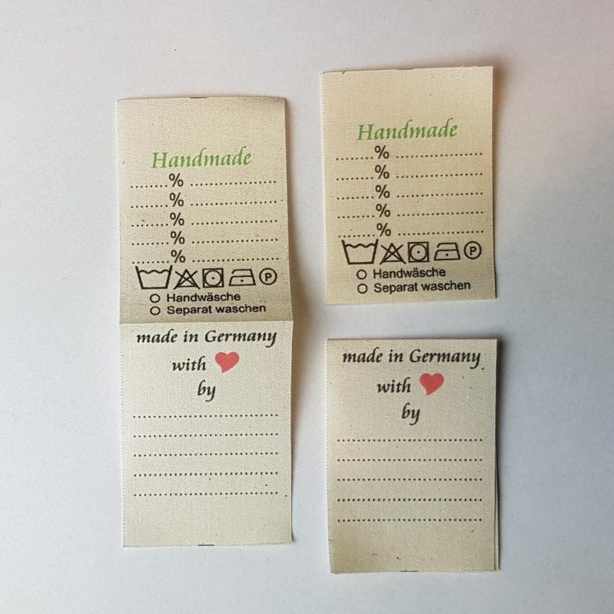 Haftetiketten selbstklebende Textiletiketten, • Individuell für Mützen, Beanies, Wollwaren, Secondhand – sehr haltbare Textile Haftetiketten. weißes Satin, farbig bedruckt. Auf Rolle, einzeln heiß angesiegelt. Auf Silconträgerpapier, zum Besseren ablösen